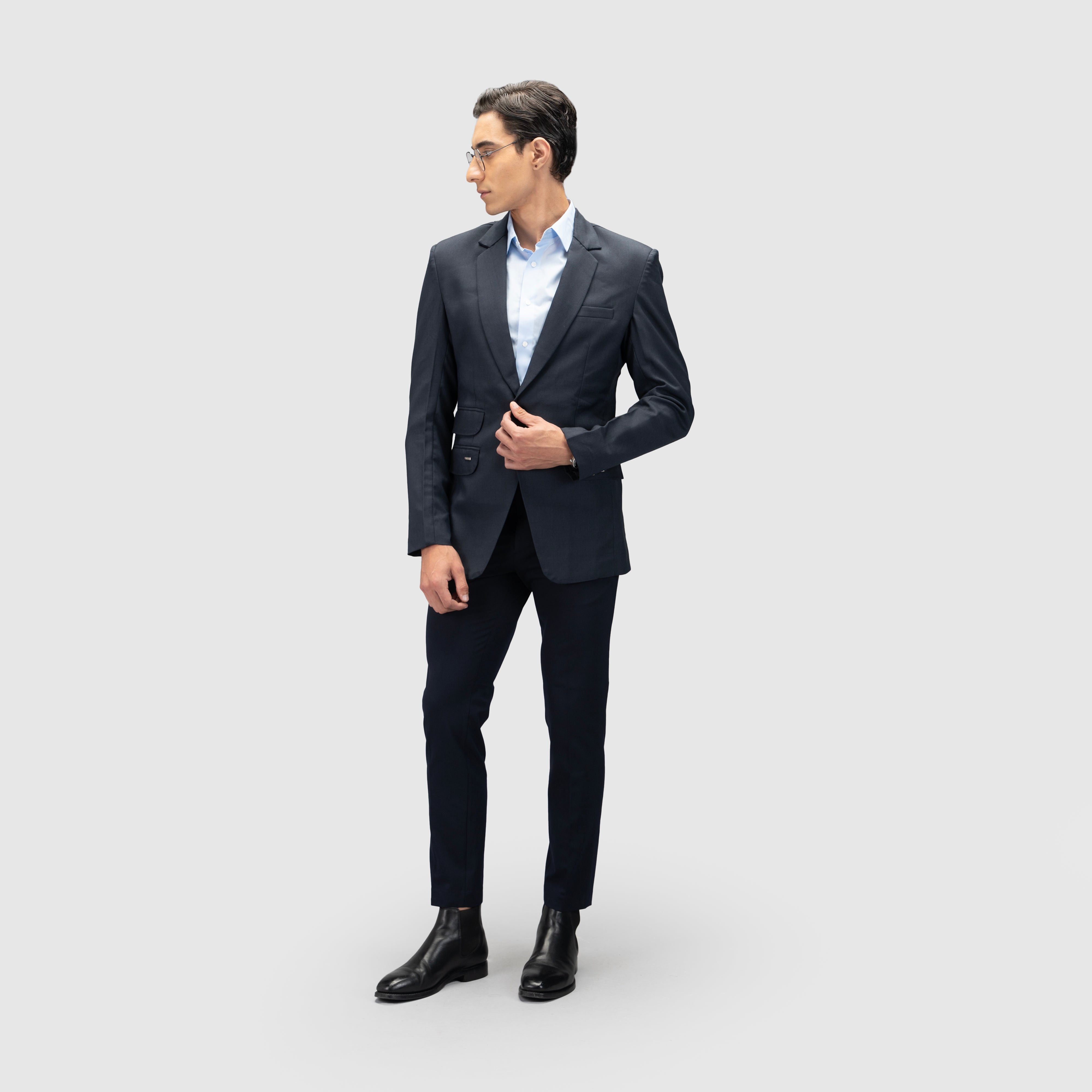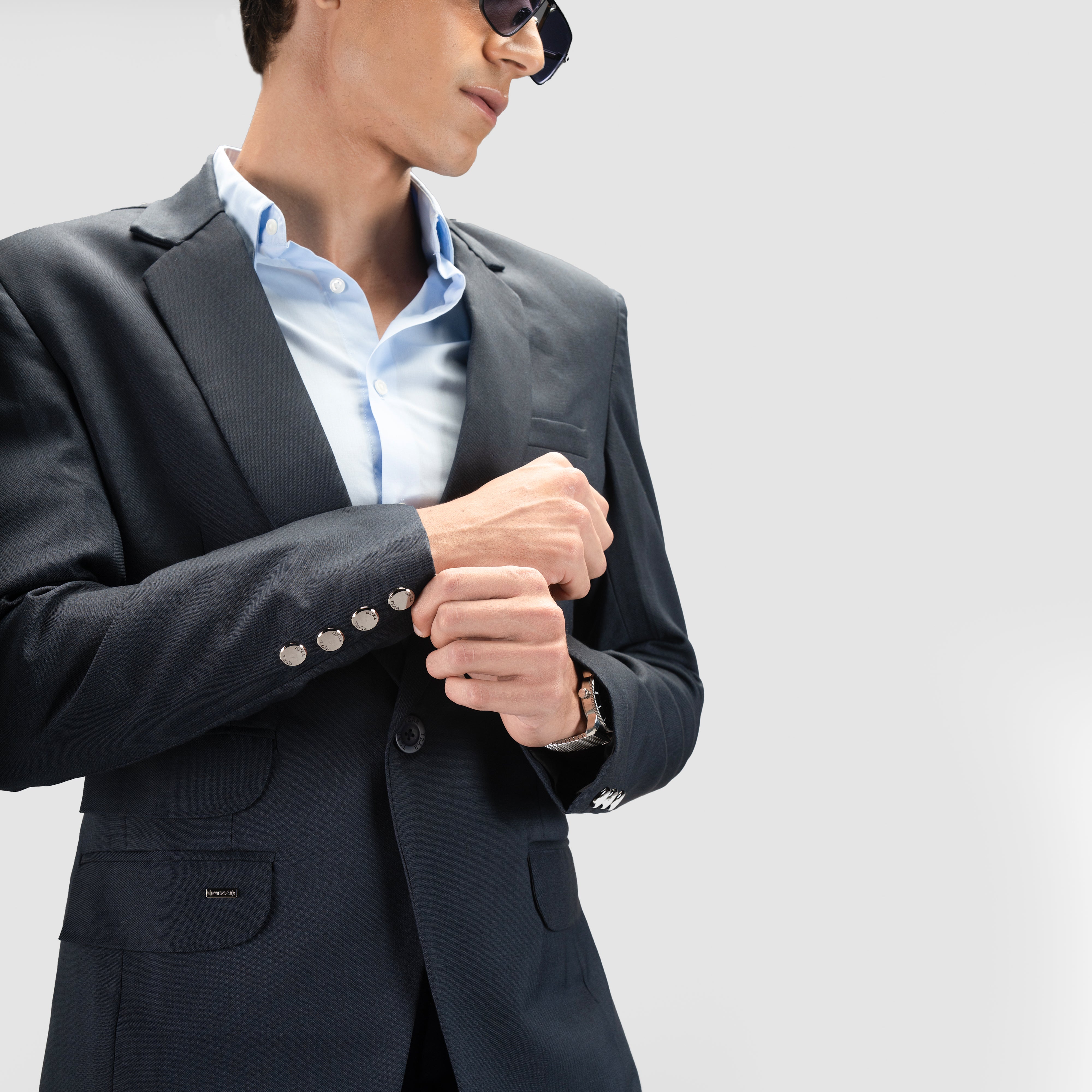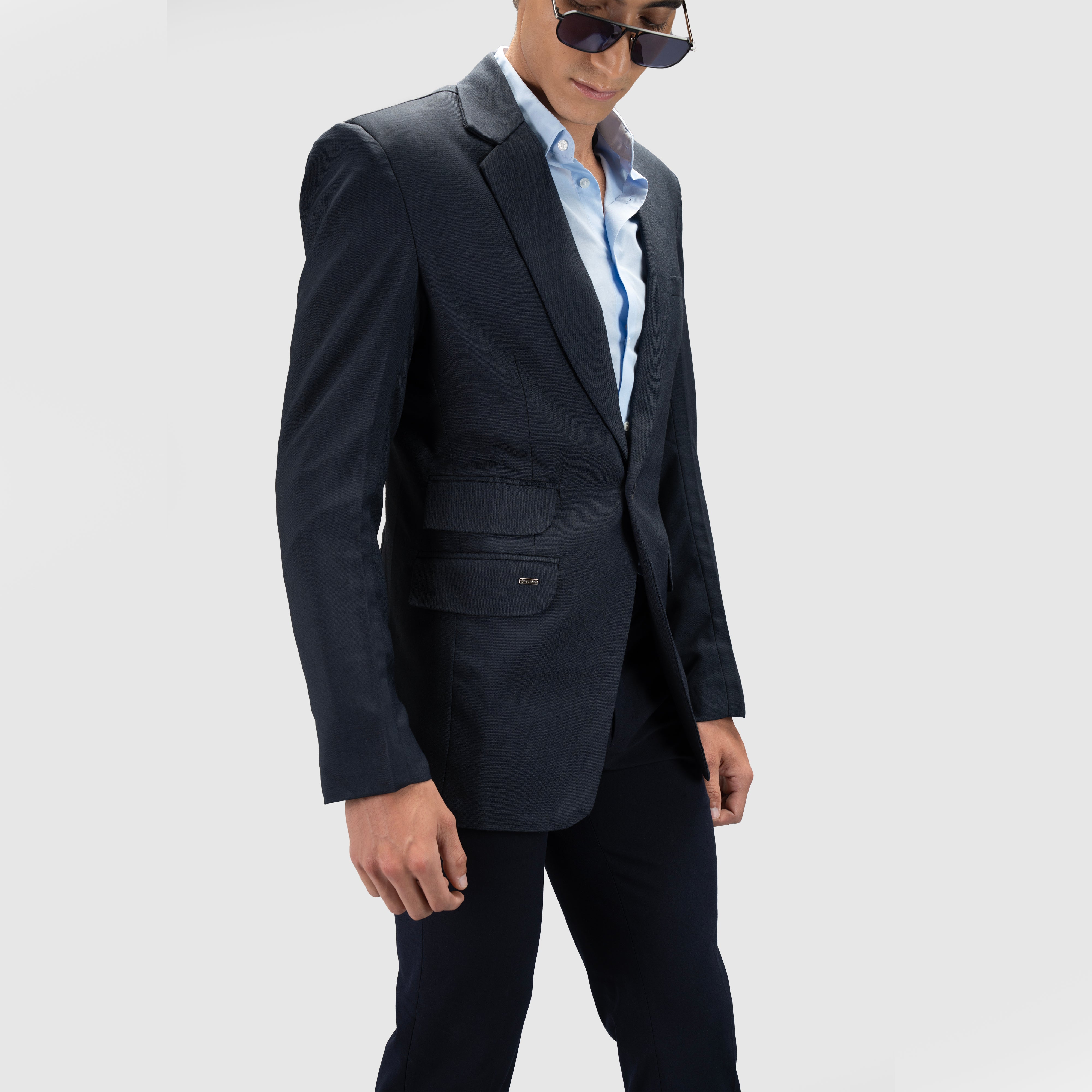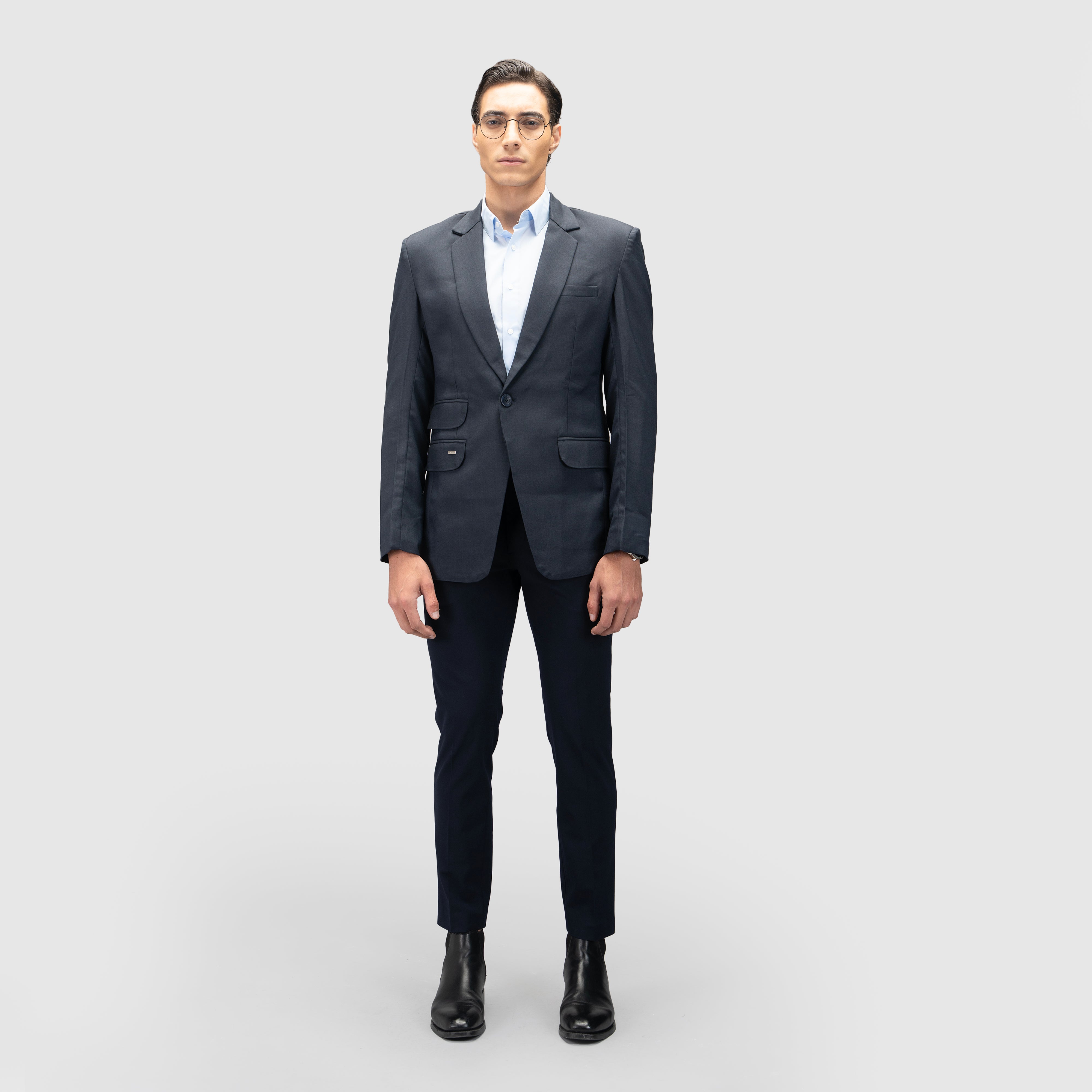 Crafted from a durable poly blend, this single-breasted jacket features an asymmetrical flap pocket for a modern edge. Finished with horn buttons, it brings subtle structure and refined individuality to everyday dressing.