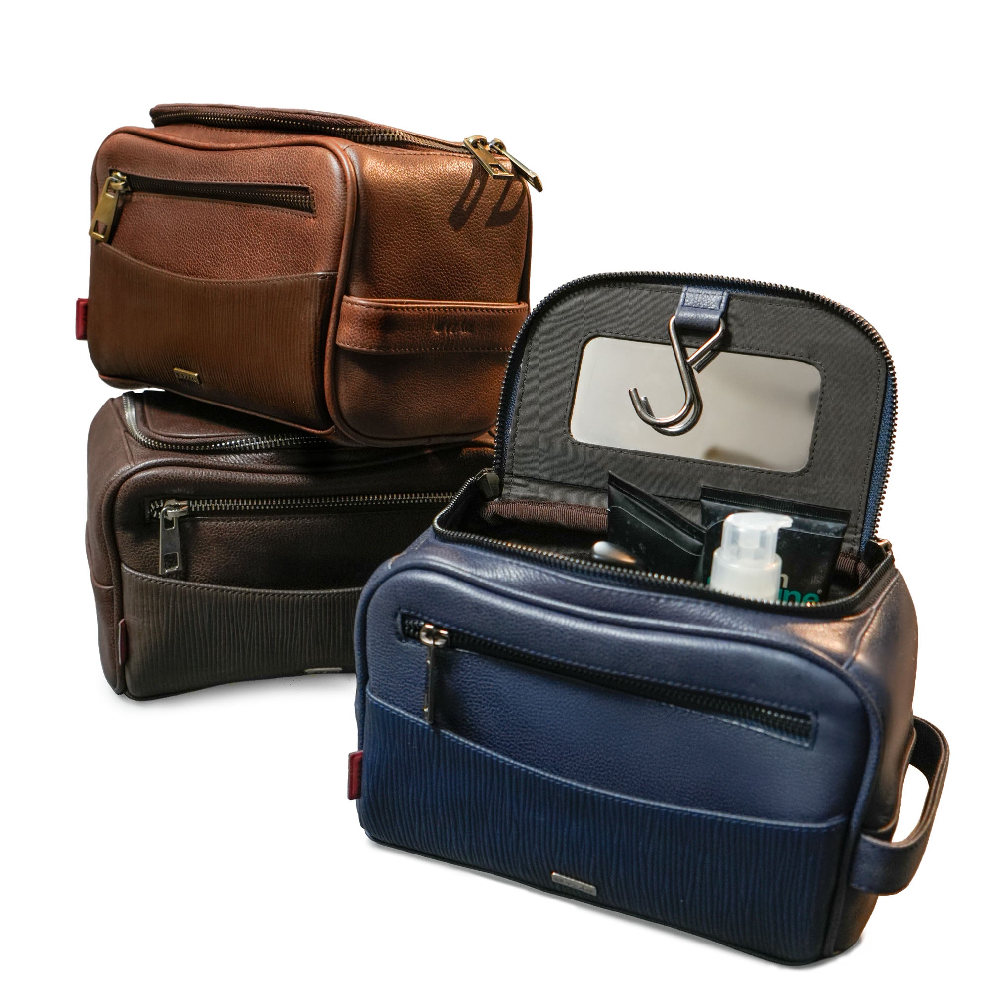 This travel toiletry bag comes in colors Coffee Brown, Navy Blue, and Brown.