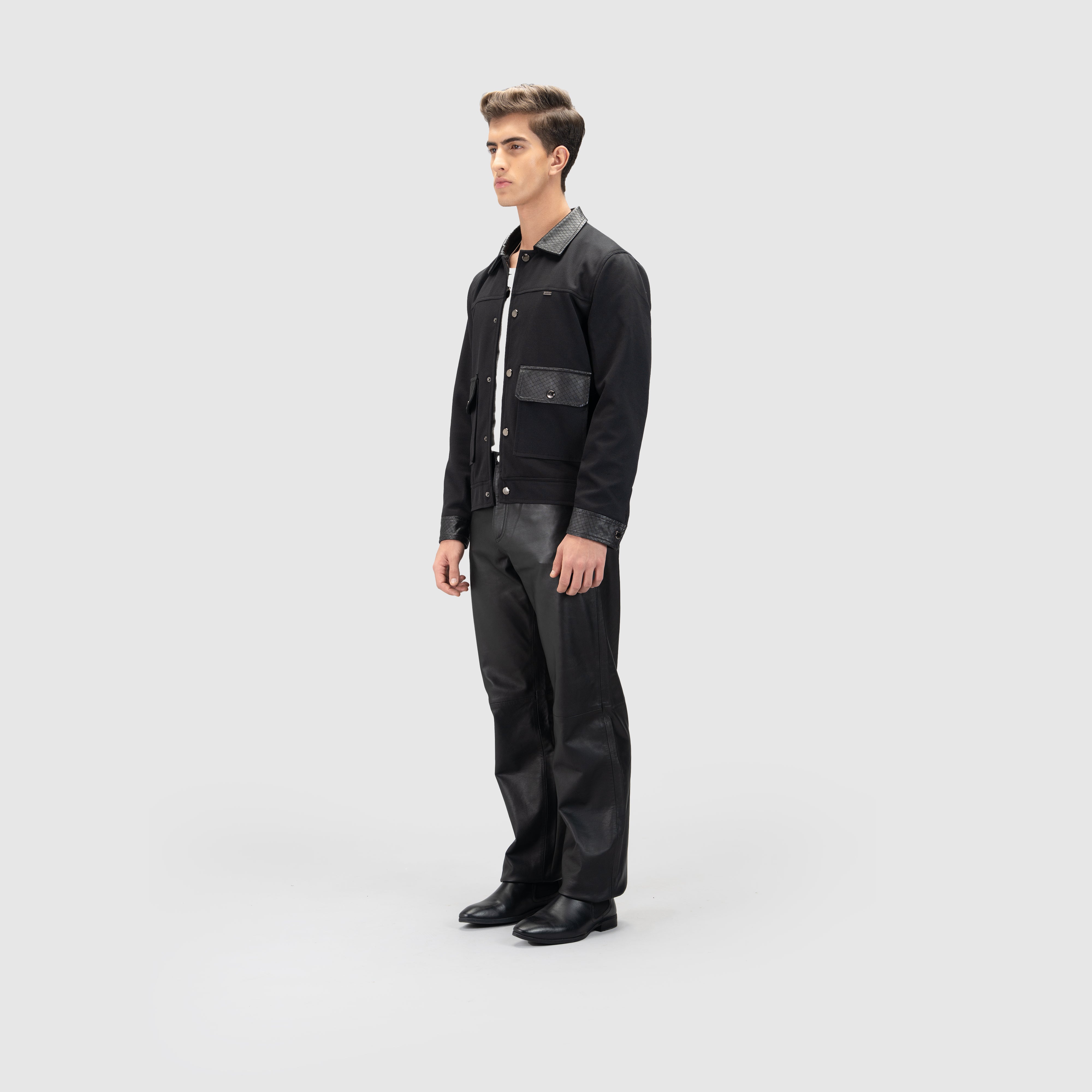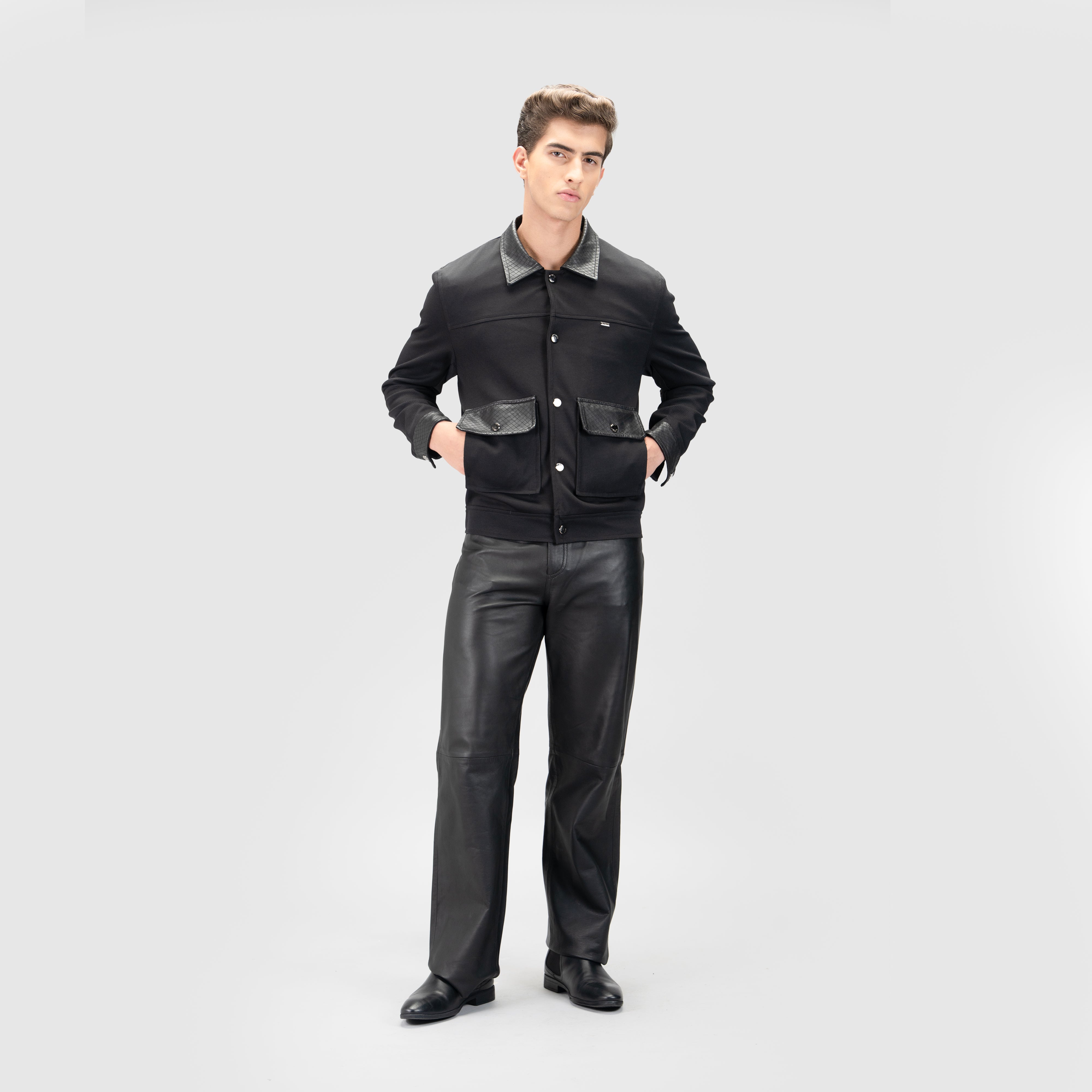 - Leather accents on collar, cuffs, and pockets for added refinement