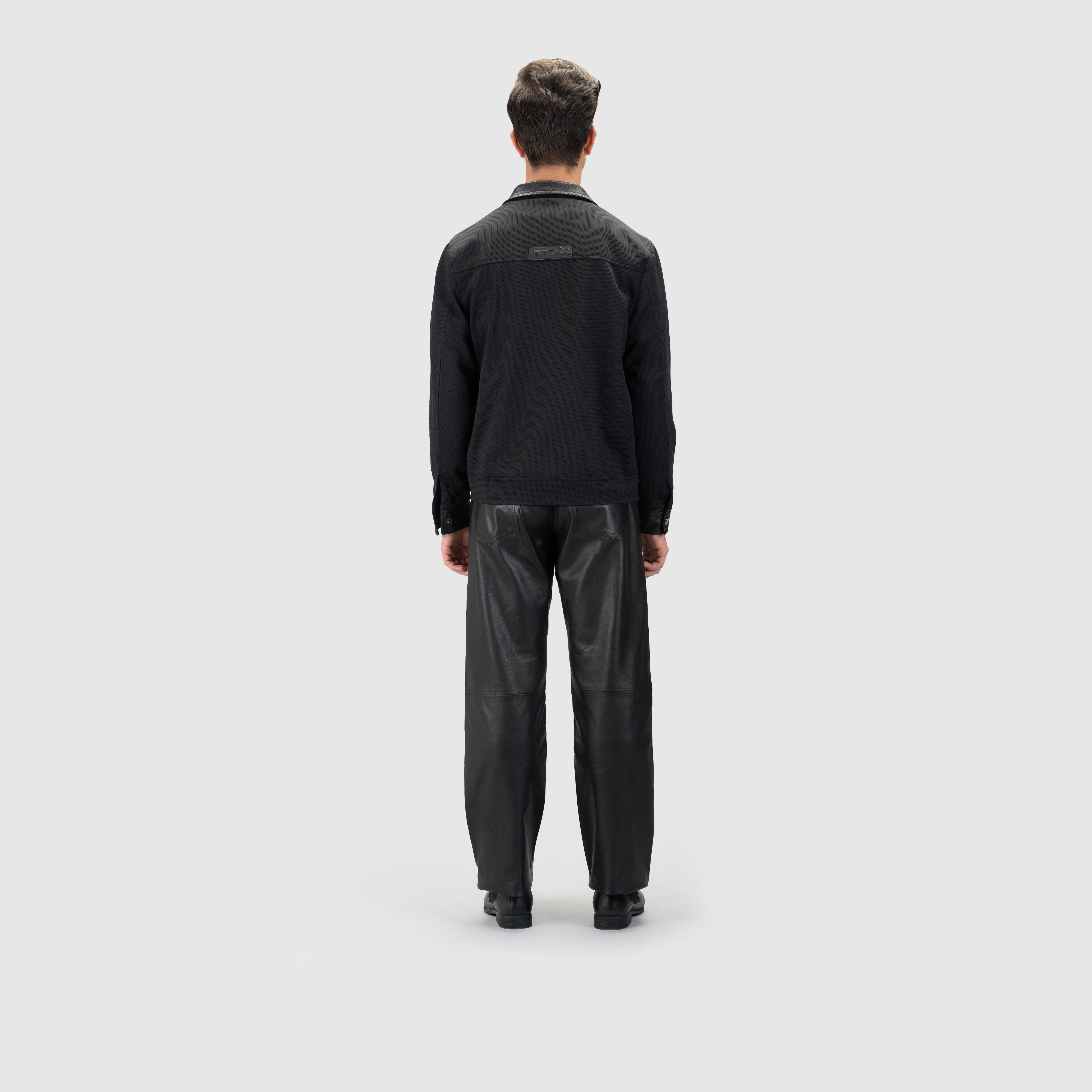 Designed for everyday ease, this jacket is crafted from a textured poly blend with leather accents on the collar, pocket flaps, and cuffs. Smart paneling, dual-purpose pockets, and a structured silhouette add functionality and effortless sophistication.