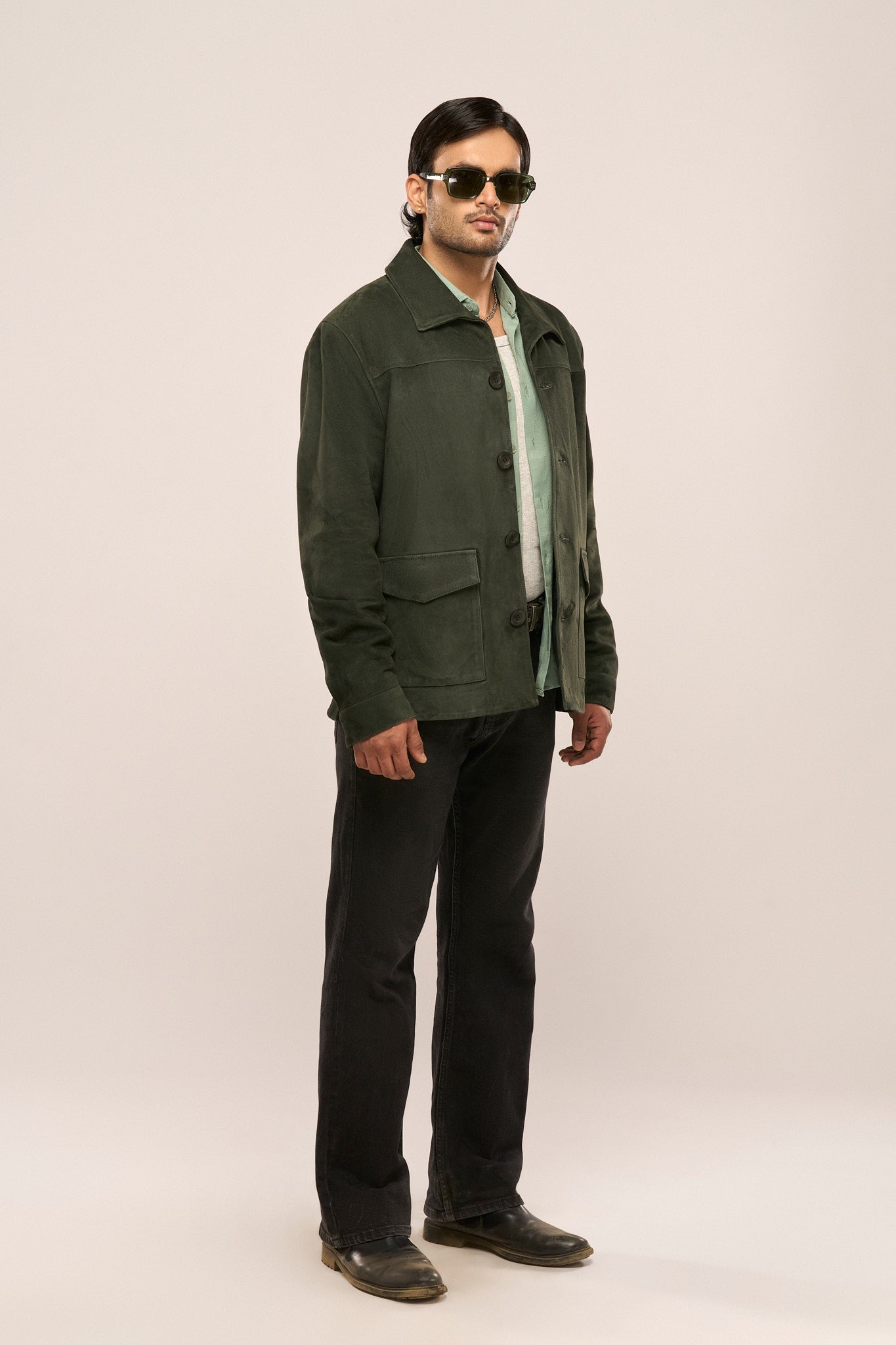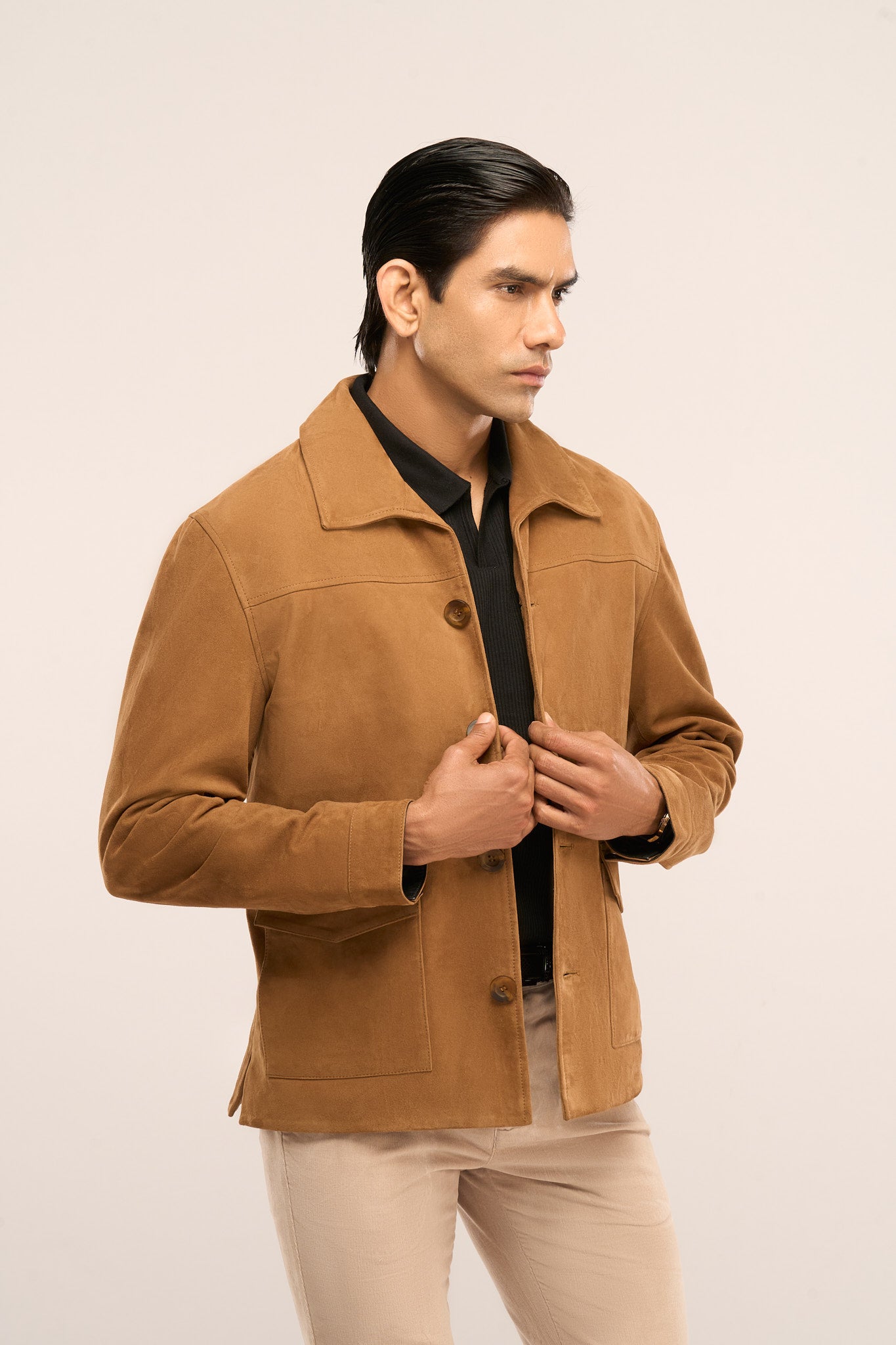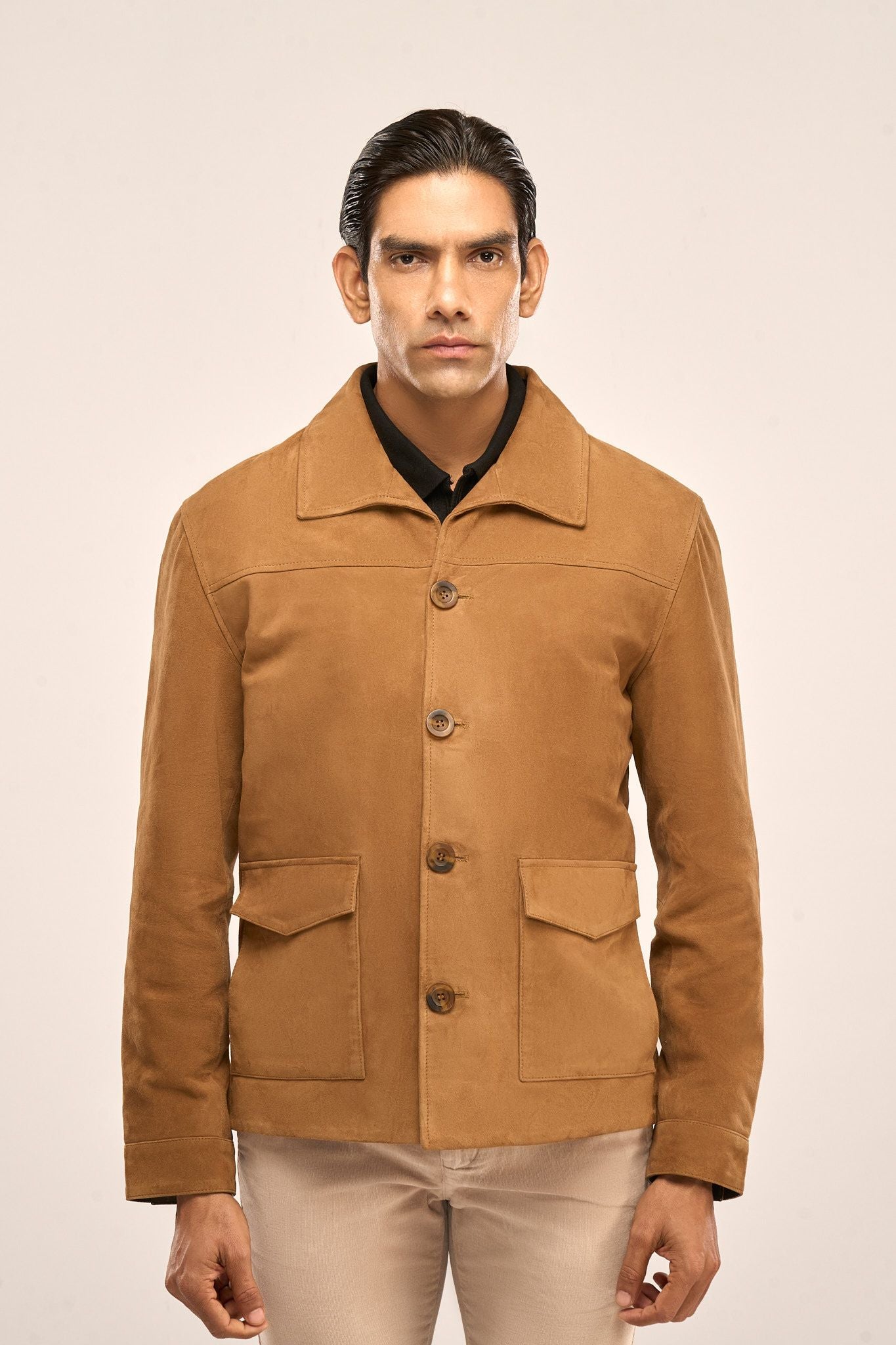 Channeling old-school charm, this jacket is crafted from premium suede leather for a blend of durability, functionality, and elegance. Designed for all-day layering, it features spacious pockets and classic horn buttons to elevate your look.