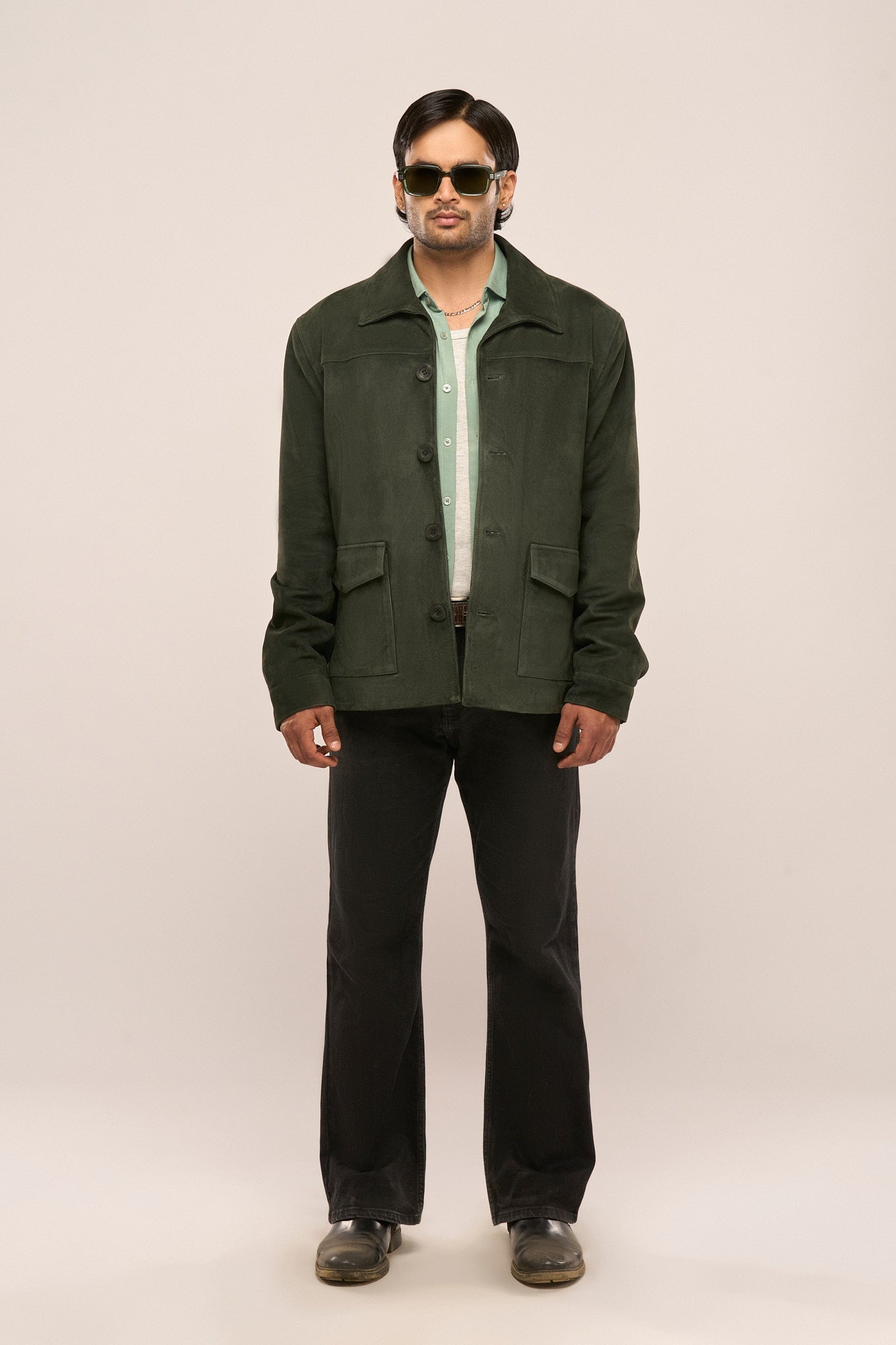 This suede leather jacket is available in Camel, Beige, and Dark Green.