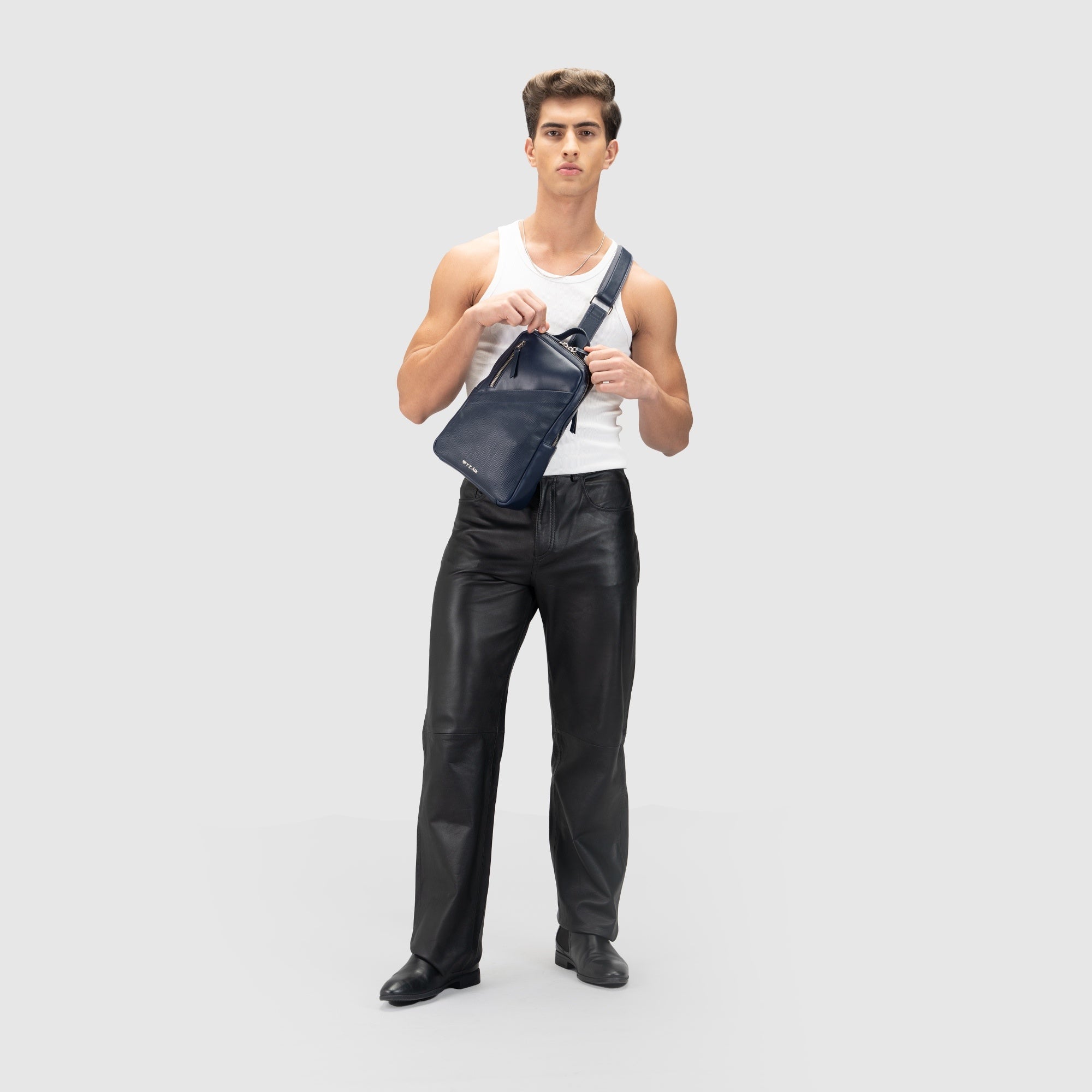 The Zenith Chest Bag is crafted from textured leather with contrast stitching, designed for seamless, hands-free travel.